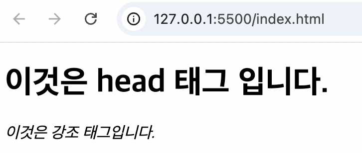 해당 코드를 실행해서 확인해본다면 다음과 같이 제목 태그와 다르게 글씨가 기울어지게 강조된 것을 확인할 수 있습니다.