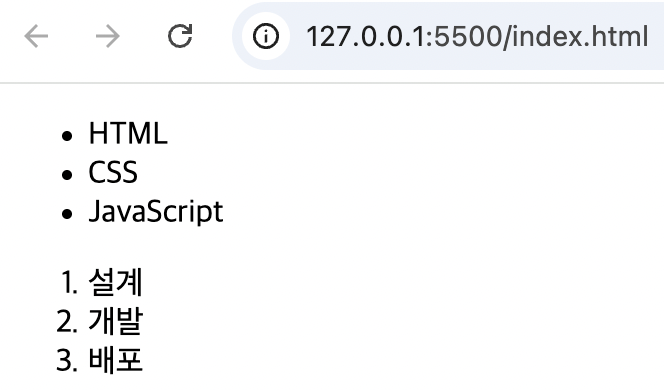 해당 코드를 실행하면 다음과 같이 <ul>태그로 감싸면 순서가 없는 리스트, <ol>태그로 감싸면 순서가 있게 리스트가