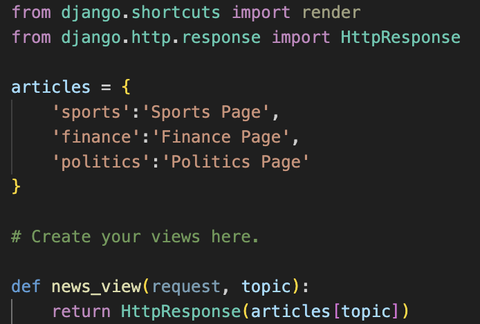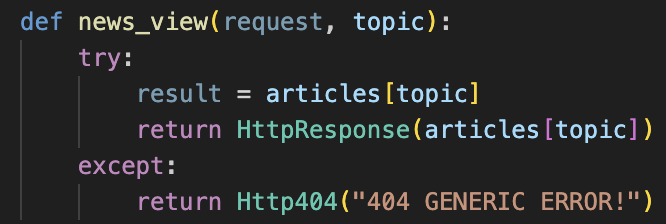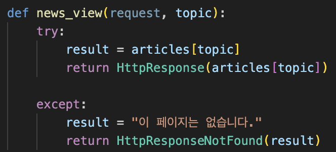 다음과 같이 try, except문을 이용해서 입력한 topic이 articles에 존재하지 않는 경우 HttpResponseNotFound함수를 이용해서 오류 창을 나타낼 수 있다.
