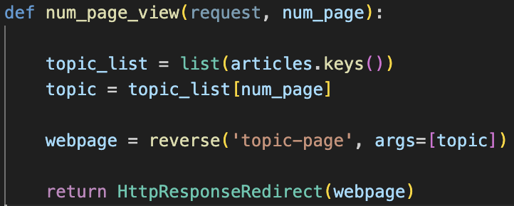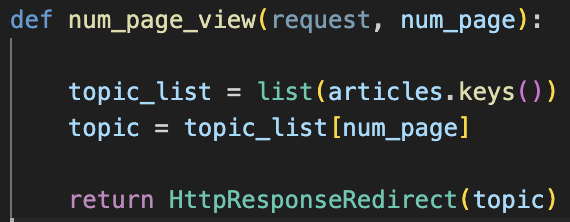 이럴때는 HttpResponseRedirect를 활용해서 다음과 같이 num_page를 사용자로부터 입력 받아, 로직을 거쳐 topic을 반환해주면 자동으로 해당 topic에 맞는 사이트를 다시 리디렉 해준다.