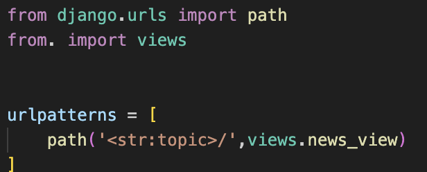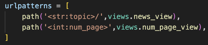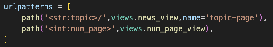 먼다 다음과 같이 기존의 news_view를 가져오는 path에 topic-page라는 URL name을 부여한다. 이렇게 하면 더 직관적으로 원하는 url을 관리할 수 있게 된다.