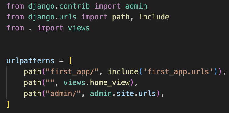 urlpattens 리스트를 path함수를 이용하여 first_app의 urls.py와 연결 시킨다. 여기서 include함수를 이용해 연결해야한다.