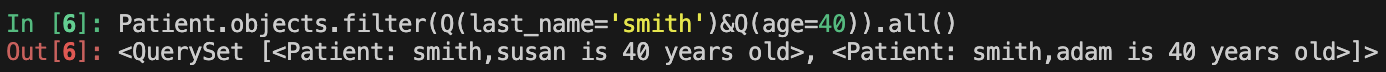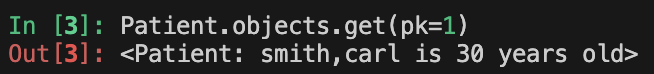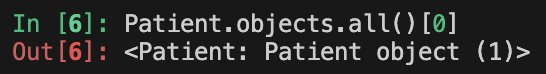 Patient.objects.all()[0]와 같이 인덱싱을 하면 다음과 같이 원하는 객체를 호출할 수 있다.