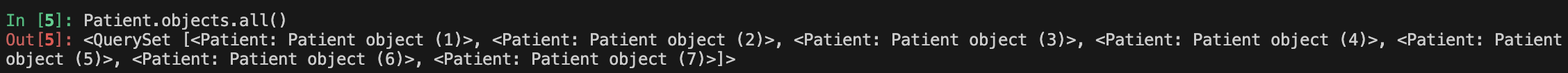 앞서 만든 office앱의 models.py에는 Patient라는 class가 정의돼 있다. 이 class를 통해 만든 객체는 위의 .save()를 통해 저장됐는데, 그러한 객체들을 가져오는 명령어가 바로 all()이다. Patient.objects.all()를 하게되면 다음과 같이 만들어놓은 모든 객체를 가져온다.