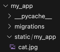 내가 사용하는 app의 이름이 my_app이고 cat.jpg라는 이미지 파일을 사용하고 싶다면 아래와 같이 폴더를 만들어 파일을 삽입하면 된다.